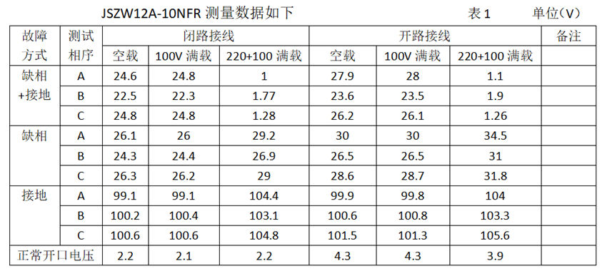 首先對(duì)我們的主要產(chǎn)品JSZW12A-10NFR系列進(jìn)行了實(shí)際測量:首先搭建試驗(yàn)平臺(tái),采用市電380V的三相四線,三相一體調(diào)壓器,容量5kVA,給3臺(tái)單獨(dú)的單相電壓互感器(10/0.1/0.22)進(jìn)行升壓,模仿故障運(yùn)行方式進(jìn)行試驗(yàn),即:缺相運(yùn)行,缺相+接地運(yùn)行,接地運(yùn)行。