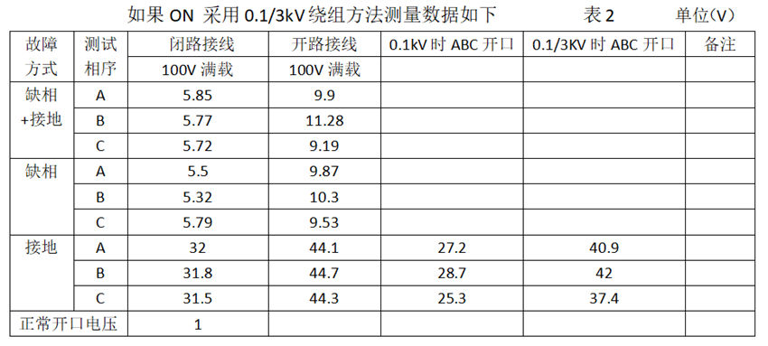 5. 表1互感器采用的ON端接入剩余繞組為10/√3/0.1kV規(guī)格,而表2采用的ON端接入剩余繞組為10/√3/0.1/3kV規(guī)格;從表1與表2的數(shù)值對(duì)比分析可以發(fā)現(xiàn),對(duì)于ON端接入剩余繞組為10/√3/0.1kV的三相五柱PT不管采用開路三角或者閉路三角,其單相接地時(shí)的開口電壓均在100V左右,且滿足3P級(jí)的要求;而采用ON端接入剩余繞組為10/√3/0.1/3kV的三相五柱PT,其單相接地時(shí)的開口電壓變化較大,采用閉路接法時(shí),其開口電壓數(shù)值接近100/3V。