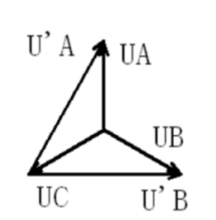 由上式推導(dǎo),當(dāng)出現(xiàn)單相接地故障時(shí),未發(fā)生故障的A、B相電壓升高√3倍,即線電壓升高了,而A相電壓方向變?yōu)闇笤瓉淼南嚯妷?,B相電壓方向變?yōu)榱顺?,此時(shí)PT二次側(cè)1a、1b相電壓也升高為原來的√3倍,其方向分別與UA’和UB’向量相同,因此開口三角電壓為: