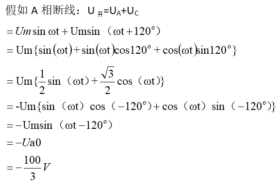 由此可以看出,當(dāng)出現(xiàn)單相斷線,也就是熔斷器保護(hù)的時(shí)候,開口電壓與該相的二次電壓大小相同,方向相反,但實(shí)際測量時(shí),其電壓小于100/3V,究其原因,當(dāng)A相斷線時(shí),剩余繞組中流過電流,該電流參與了B、C相的反向勵(lì)磁,產(chǎn)生了電壓降,因此就造成了單相斷線實(shí)際的開口電壓小于100/3V;兩相熔斷器斷線燒毀時(shí),其開口電壓與正常相的二次電壓大小相等,經(jīng)過反復(fù)測試,兩相斷線時(shí),其開口電壓為100/3V左右。