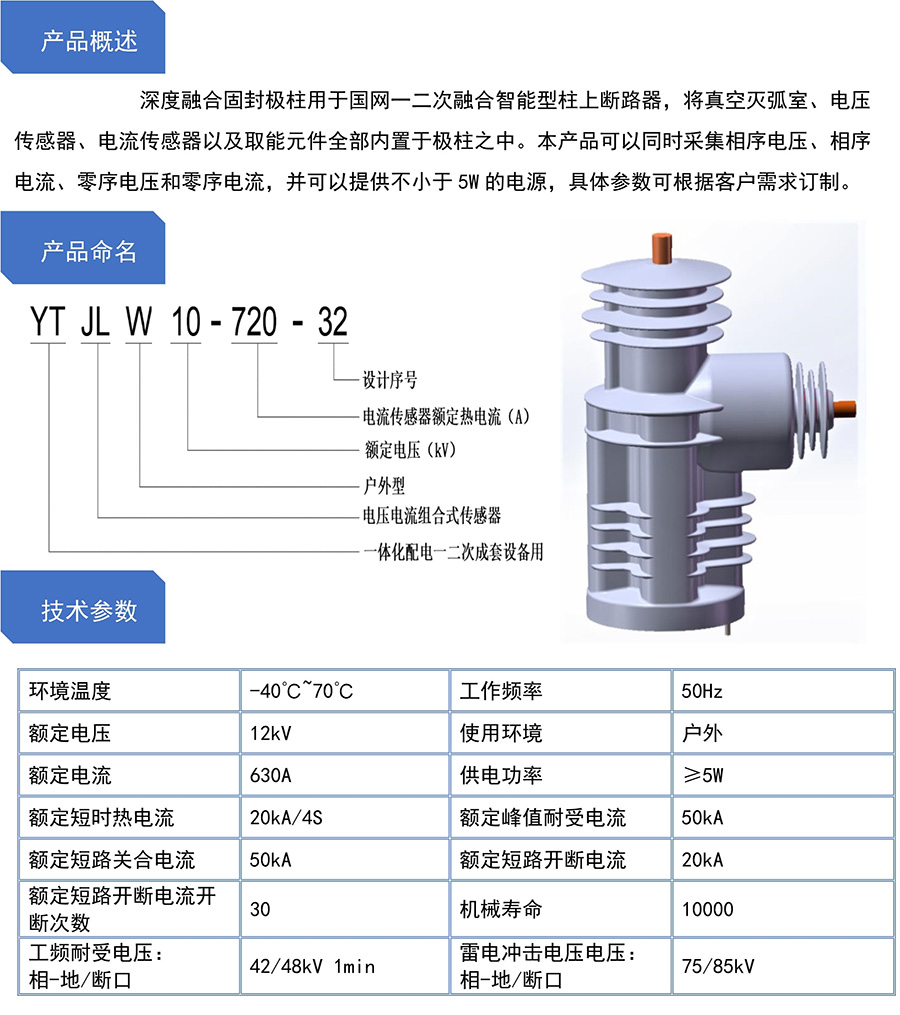 產(chǎn)品介紹:深度融合固封極柱用于國(guó)網(wǎng)一二次融合智能型柱上斷路器,將真空滅弧室、電壓傳感器、電流傳感器以及取能元件全部?jī)?nèi)置于極柱之中。